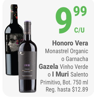 Honoro Vera Monastrel Organic o Grnacha Gazela Vinho Verde o I Muri Salento Primitivo, Bot. 750 ml