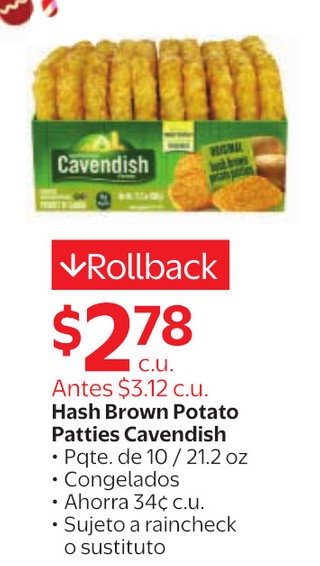 Hash Brown Potato Patties Cavendish Pqte. de 10 / 21.2 oz Congelados