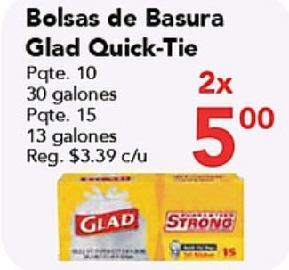 bolsas basura glad quick-tie pqte alones pqte. reg. $c/u strong