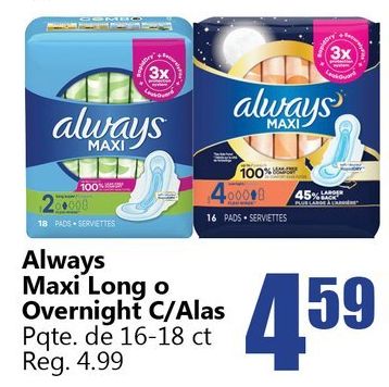 always maxi pads serviettes long overnight c/alas pqte reg. lande