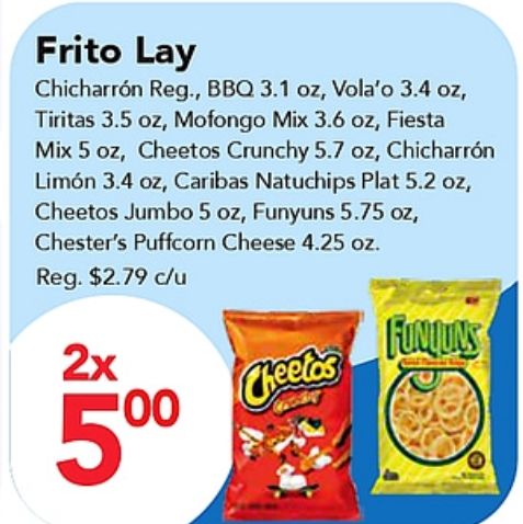 frito chicharrón vola'o tiritas mofongo fiesta cheetos crunchy limón caribas natuchips plat jumbo funyuns chester's puffcorn cheese reg. $c/u fonions