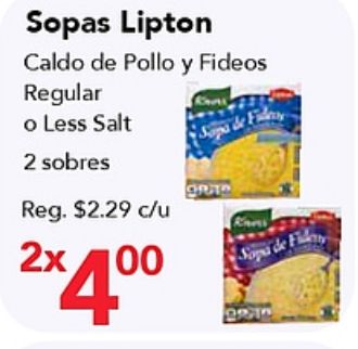 sopas lipton caldo pollo fideos regular less salt sobres $c/u xfiley sopa