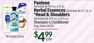 Pantene Variedad de 10.4 oz. a 12 oz. Herbal Essences Variedad de 11.7 oz. o Head & Shoulders Variedad de 10.9 oz. a 12.5 oz. Shampoo o Conditioner