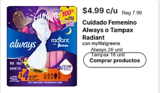 always radiant pads serviettes zero feel q!!!! $c/u cuidado femenino tampax mywalgreens unit comprar productos
