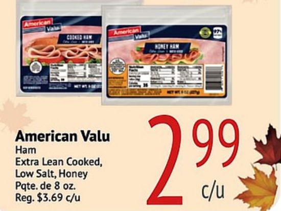america cooked american valu extra lean salt, honey pqte reg. $c/u