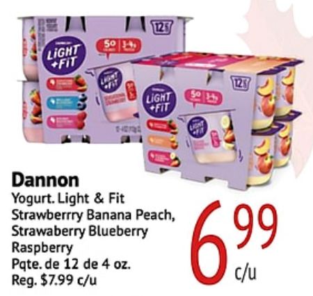 light +fit dannon yogurt strawberrry banana peach strawaberry blueberry raspberry pqte. reg. $c/u ,c/u