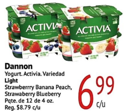 activi activia dannon yogurt activia. variedad light strawberrry banana peach strawaberry blueberry pqte. reg. $c/u