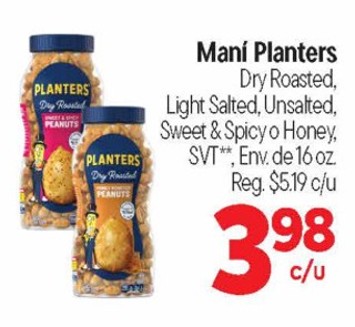 Manà Planters Dry Roasted, Light Salted, Unsalted, Sweet & Spicy o Honey, SVT**, Env. de 16 oz.