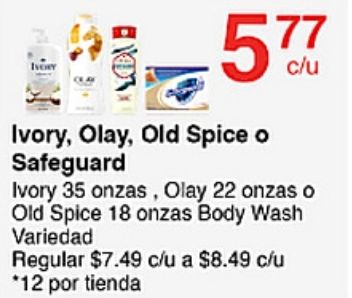 ivory olay, spice safeguard onzas, olay onzas body wash variedad regular $c/u *por tienda