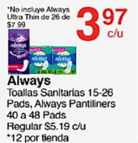 incluye always ultra thin $anys toallas sanitarias pads pantiliners regular $c/u *por tienda