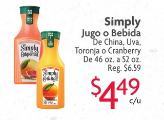 Simply Jugo o Bebida De China, Uva, Toronja o Cranberry De 46 oz. a 52 oz.