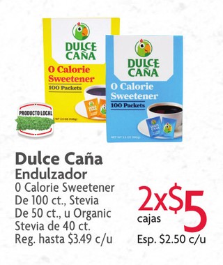 Dulce Caña Endulzador o Calories Sweetener De 100 ct., Stevia De 50 ct., u Organic Stevia de 40 ct.