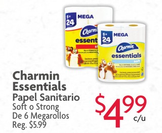 Charmin essentials papel sanitario soft o strong de 6 megarollos