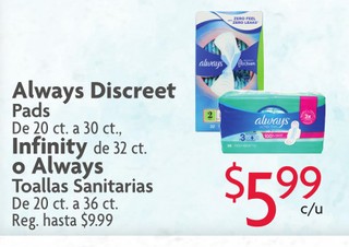 Always Discreet Pads De 20 ct. a 30 ct., Infinity de 32 ct. o Always Toallas Sanitarias De 20 ct. a 36 ct.