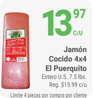 Jamón Cocido 4x4 El Puerquito Entero U.S. 7.5 lbs.