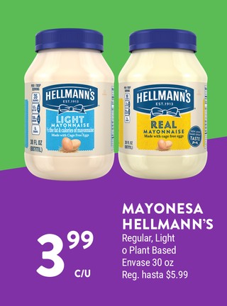 MAYONESA HELLMANN'S Regular, Light o Plant Based Envase 30 ozZ