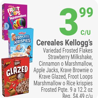 Cereales Kellogg's Variedad Frosted Flakes Strawberry Milkshake, Cinnamon o Marshmallow, Apple Jacks, Krave Brownie o Krave Glazed, Froot Loops Marshmallow.
