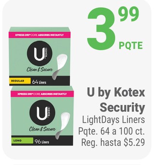 U by Kotex Security LightDays Liners Pqte. 64 a 100 ct.