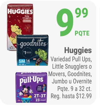 Huggies Variedad Pull Ups, Little Snugglers o Movers, Goodnites, Jumbo u Overnite Pqte. 9 a 32 ct.