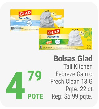 Bolsas glad tall kitchen febreze gain o fresh clean 13 g pqte. 22 ct