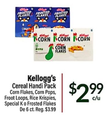 frosted frostep flakes corn kellogg's cereal handi pack pops, froot loops, rice krispies, special reg. $$c/u