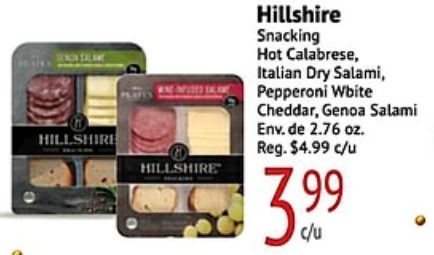 hillshire snacking calabrese italian salami, pepperoni wbite cheddar, genoa salami reg. $c/u