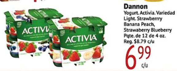 activu activia dannon yogurt activia. variedad light. strawberrry banana peach strawberry blueberry pate. reg. $c/u