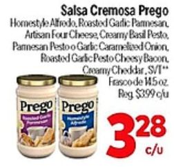 salsa cremosa prego homestyle alfredo roasted garlic parmesan artisan four cheese, creary basil pesto caramelized onion, cheesy bacon, creamy cheddar, frasco