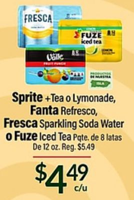 fresca valle fuze iced isla sprite +tea lymonade fanta refresco, sparkling soda water pqte latas reg. $$c/u