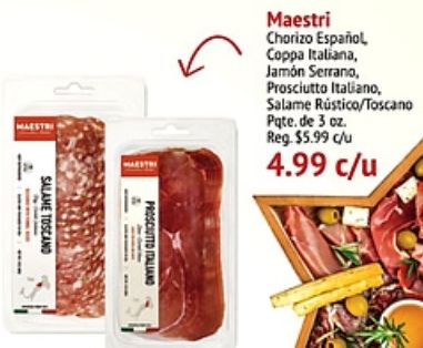 maestri chorizo español coppa italiana jamón serrano, prosciutto italiano, salame rústico/toscano patede reg. $c/u italiano toscand