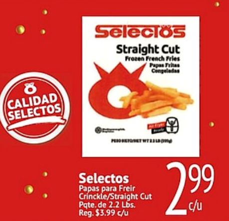 calidad selectos selecios straight frozen french fries papas fritas congeladas freir crinckle/straight pqtede reg. $c/u