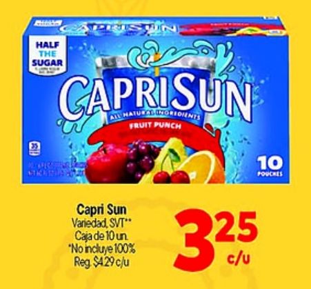half sugar caprisun natural norionents fruit punch pouches capri variedad svt" caja incluye $c/u