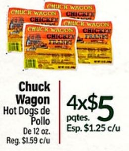 chuck wagon chicken chicke wacon franks x$hot dogs pollo reg. $c/u pqtes. esp.