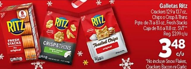 ritz fresh stacks original crisp&thins toasted chips grab galletas crackers crisp thins pate caja svt" $c/u incluye snow flakes, bacon garlic