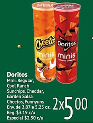 mear cheela doritos minis mini regular cool ranch sunchips. cheddar, garden salsa cheetos, funnyuns env. reg. $c/u especial