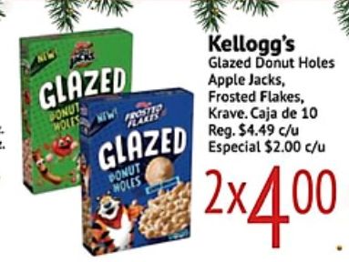 glazed donut woles frostt flakes ponut holes kellogg's apple jacks frosted flakes, krave caja reg. $c/u especial