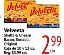 velvee velveeta shells cheese bacon broccoli, original caja reg. $c/u bard