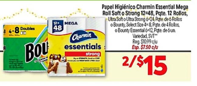 doubles charmin essentials strong papel higiénico essential mega roll soft pqte rollos, ultra pote rollos bounty, select size pate. bounty pate.deóun. variedad, $c/u esp.