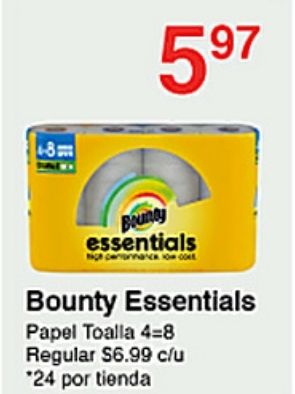 bounty essentials papel toalla =regular $c/u *por tienda
