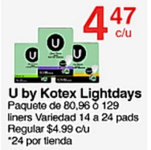 kotex lightdays paquete liners variedad pads regular $c/u *por tienda