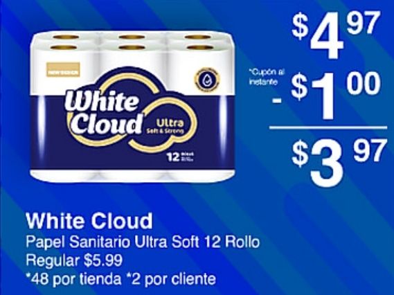 white cloudra seft streng "cupón instante $$$white cloud papel sanitario ultra soft rollo regular $*por tienda *por cliente