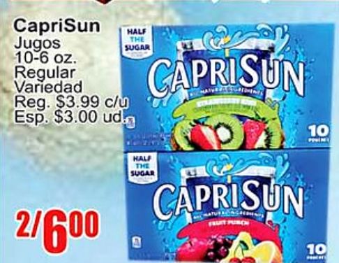 caprisun jugos regular variedad reg. $c/u esp. $ud. /half sugar half