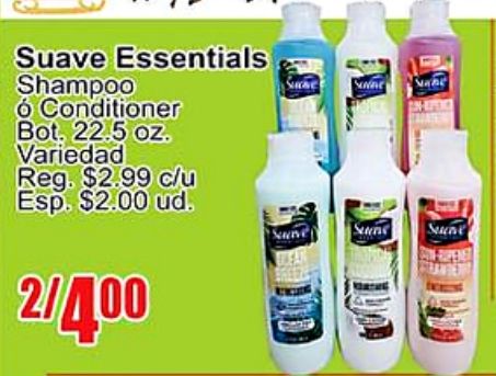 suave essentials shampoo conditioner variedad reg. $c/u esp. $ud. /sucave snac suche sune sucive tranded