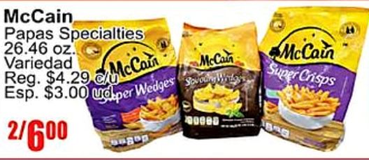 mccain papas specialties variedad reg. $ccain esp. $udper wedges sovoung whigs super crisps