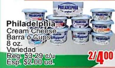 philadelphia cream cheese barra cups variedad reg. $c/u esp. $ud.
