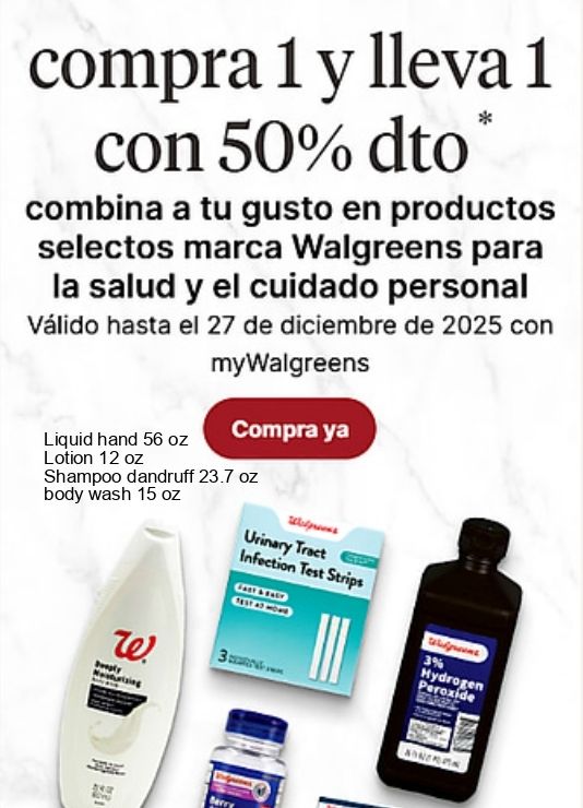 compra dto* combina gusto productos selectos marca walgreens salud cuidado personal vĂ¡lido diciembre liquid hand lotion mywalgreens shampoo dandruff body wash urinary tract infection test strips hydrogen peroxide