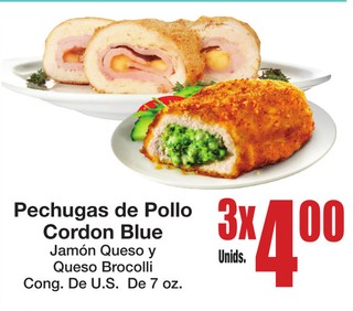 Pechugas de pollo cordon blue jamon queso y queso brocolli cong. de U.S. De 7 oz.