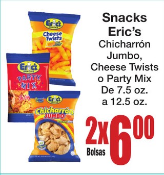 Snacks Eric's Chicharron Jumbo Cheese Twists o Party Mix De 7.5 oz.