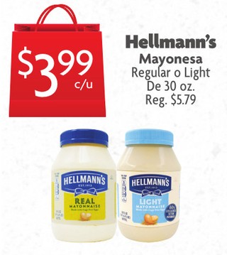 Hellmann's Mayonesa Regular o Light De 30 oz.
