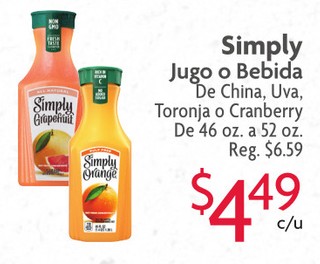 Simply Jugo o Bebida De China, Uva, Toronja o Cranberry De 45 oz. a 52 oz.